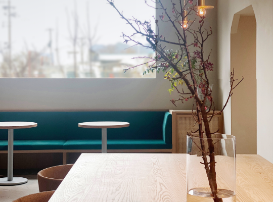 カフェスペースを彩る季節の草花に、やわらかい陽が差し込むピクチャーウィンドウ。居心地の良い空間で、身体に優しく、美味しいお料理やスイーツを楽しんでいただけます。お食事のしやすい大きなテーブルもご用意しておりますので、どうぞゆっくりとプライベートタイムをお過ごしください。