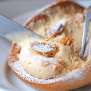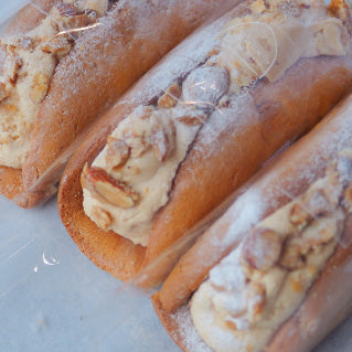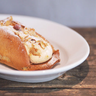 ふんわりコーヒー味のスポンジ生地(ビスキュイ)に、香ばしいアーモンドバタークリームをたっぷりと巻きで、アンノートルお目当ての自家製塩キャラメルアーモンドナッツをトッピング!